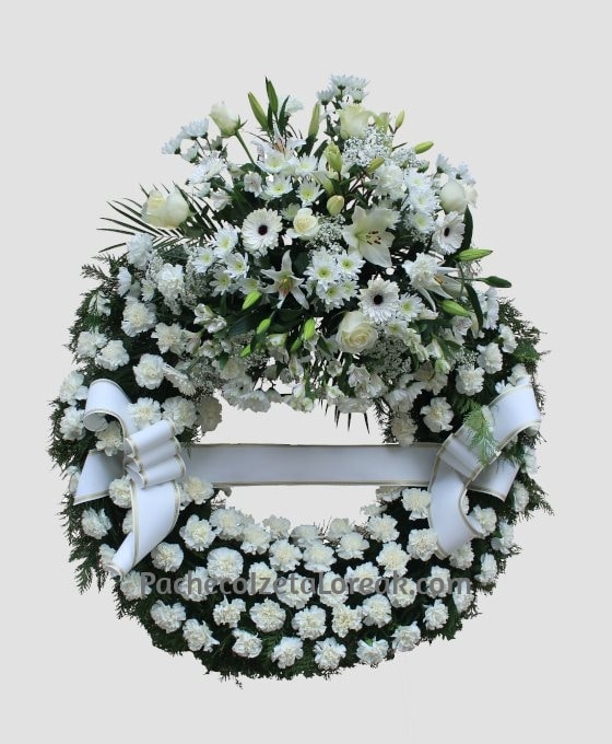 Corona Extra Clavel Blanco, con un aro de 70-80cm, decorado con 90-100 claveles blancos. Esta Corona Extra Clavel Blanco para defunción, incluye un cabezal en la parte superior de la corona que incluye 10 varas de margaritas,4 lilium LA, 4 gerberas, 6 rosas cortas, todo ello adornado con preciosos verdes variados. Esta Corona de flores de funeral está realizada siempre con flores de la máxima calidad. Somos floristas profesionales en el sector de los arreglos florales fúnebres. Nuestras flores para fallecimiento son siempre frescas y están suministradas por proveedores nacionales e internacionales, por lo cual siempre nuestras coronas fúnebres son de primera calidad.